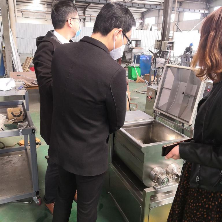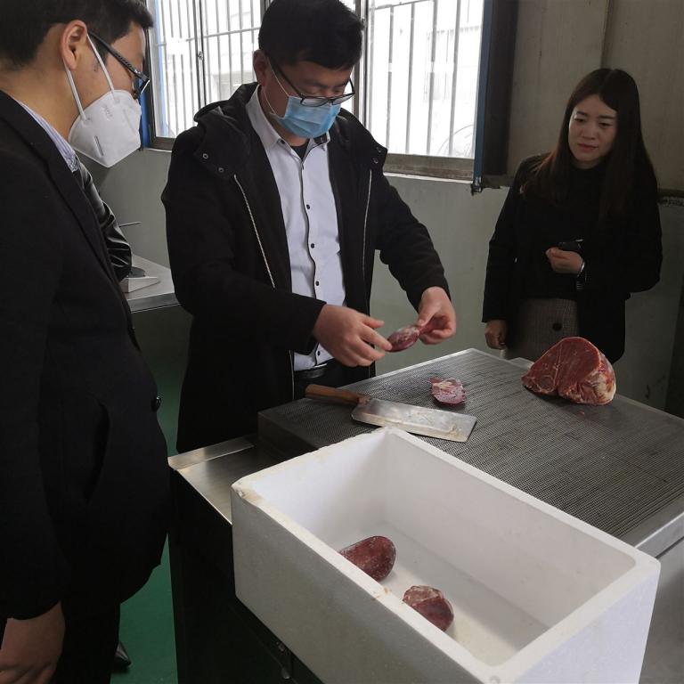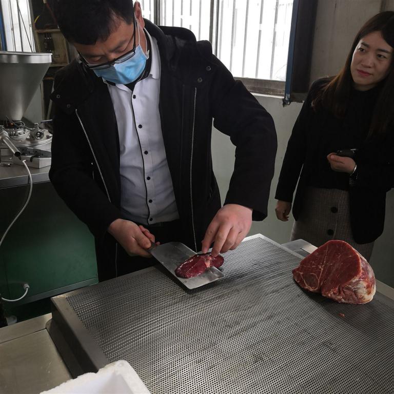 安徽客戶是一家加工火鍋肉制品的生產廠家,該客戶帶來冷凍的原料肉進行現場試機。