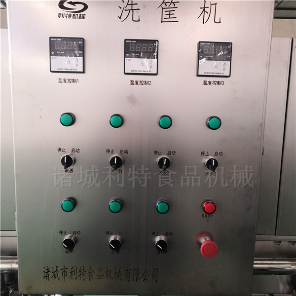 一人將臟污的筐子倒扣放置在清洗機的傳送鏈條上,鏈條的傳動帶動箱子進入清洗區域,經過預洗段、主洗段、漂洗段、凈水沖洗段對筐子進行全部的高溫滅菌高壓清洗處理,電機帶動鏈條向出口處傳輸,操作人員將箱子從清洗機上取出從而完成洗箱操作。 兩人操作即可完成清洗工作。