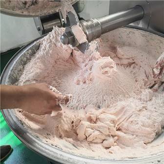溫度過高導致蛋白質變性凝固,影響后續工藝。破碎粒度太大,則導致斬拌工藝所需時間延長,同時容易導致混料不均勻;破碎粒度太小又會使肉粒之間提前形成凝膠體,阻礙下一步混料進行。