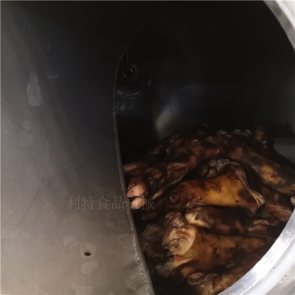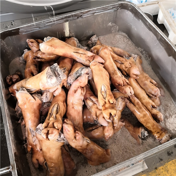 經(jīng)過真空滾揉機(jī)腌制后,原料現(xiàn)在是在規(guī)定的時(shí)間內(nèi)腌制完畢,將腌制后的豬爪用料車接下