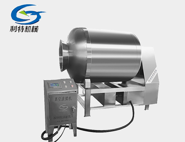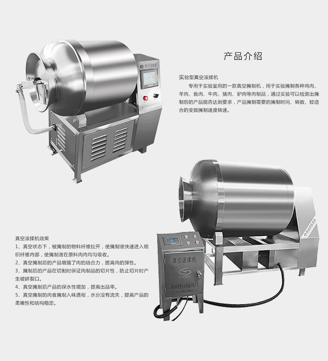 是肉制品加工腌制必選設備,真空狀態下,讓肉在滾筒內上下翻動,相互撞擊、摔打、達到快速腌制目的。真空腌制后提高了肉的嫩度,增強肉的結合力和保水性,大大縮短了腌制時間,提高了產品的出品率。滾揉工作時的工作環境溫度為0~3℃為宜。