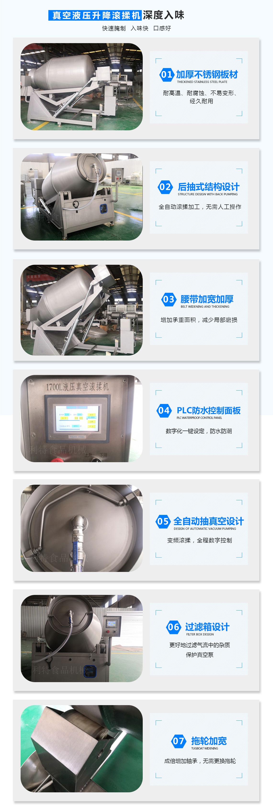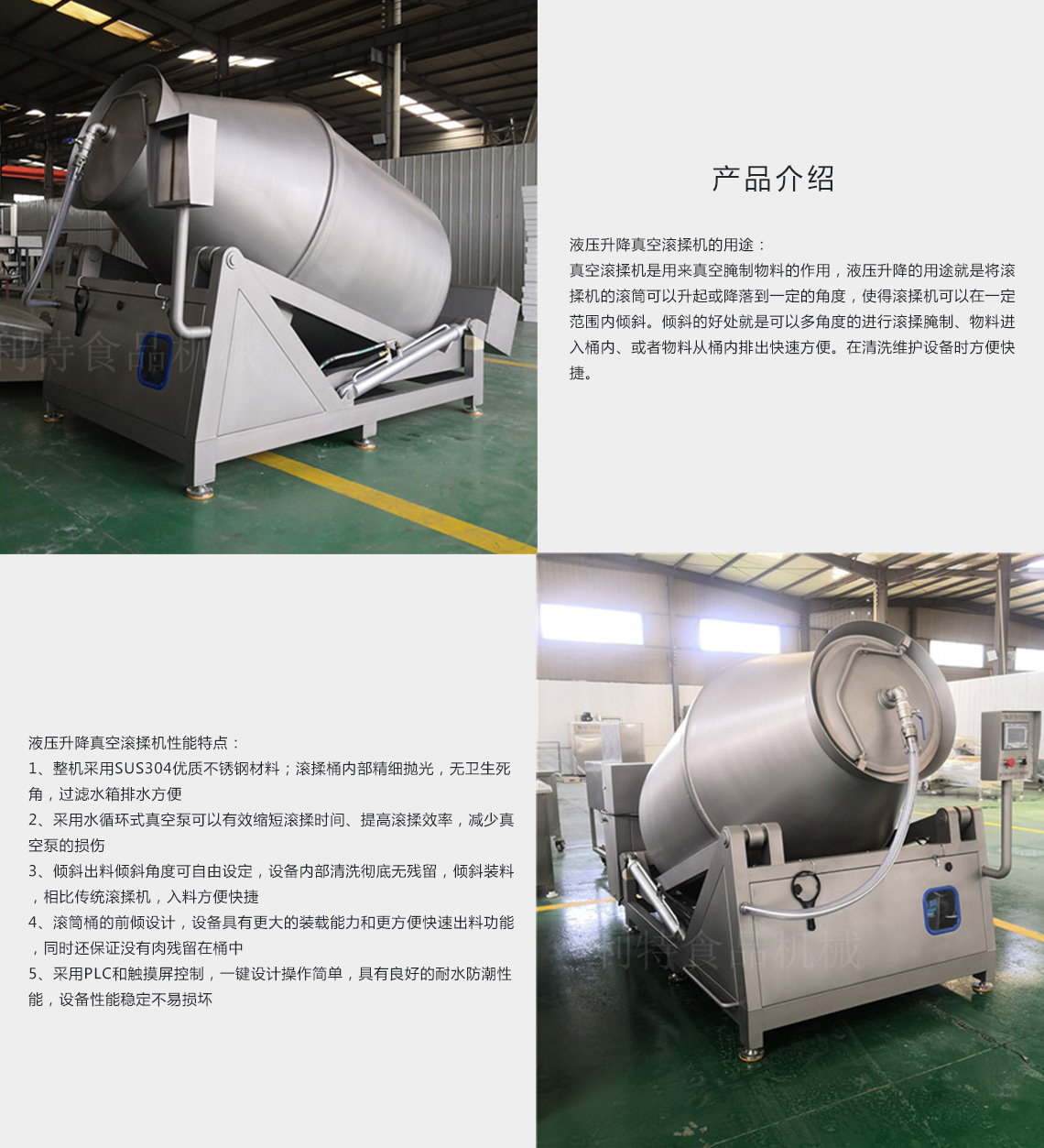 真空滾揉機是用來真空腌制物料的作用,液壓升降的用途就是將滾揉機的滾筒可以升起或降落到一定的角度,使得滾揉機可以在一定范圍內(nèi)傾斜。傾斜的好處就是可以多角度的進(jìn)行滾揉腌制、物料進(jìn)入桶內(nèi)、或者物料從桶內(nèi)排出快速方便。在清洗維護(hù)設(shè)備時方便快捷。