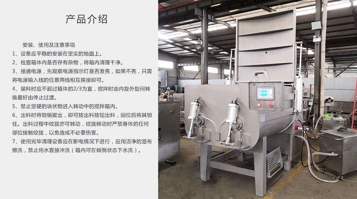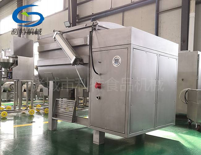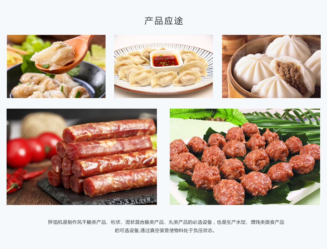 在真空狀態下物料攪拌均勻、充分膨脹、無氣泡、彈性好、色澤鮮艷并能夠提取蛋白質,混料效率高,是改善產品品質的一款必備設備。是制作風干腸類產品、粒狀、泥狀混合腸類產品,丸類產品的主要設備,同時也是生產水餃、餛飩類面食產品的可選設備。